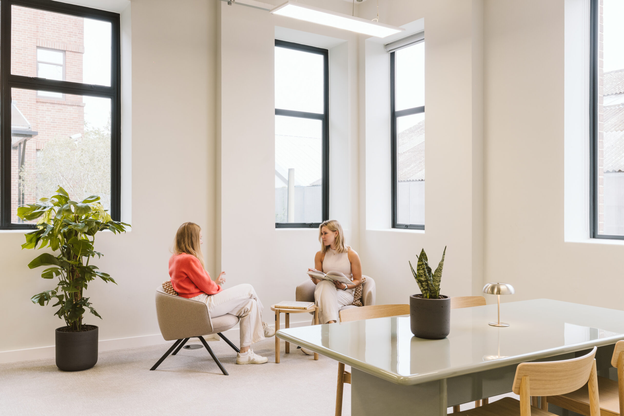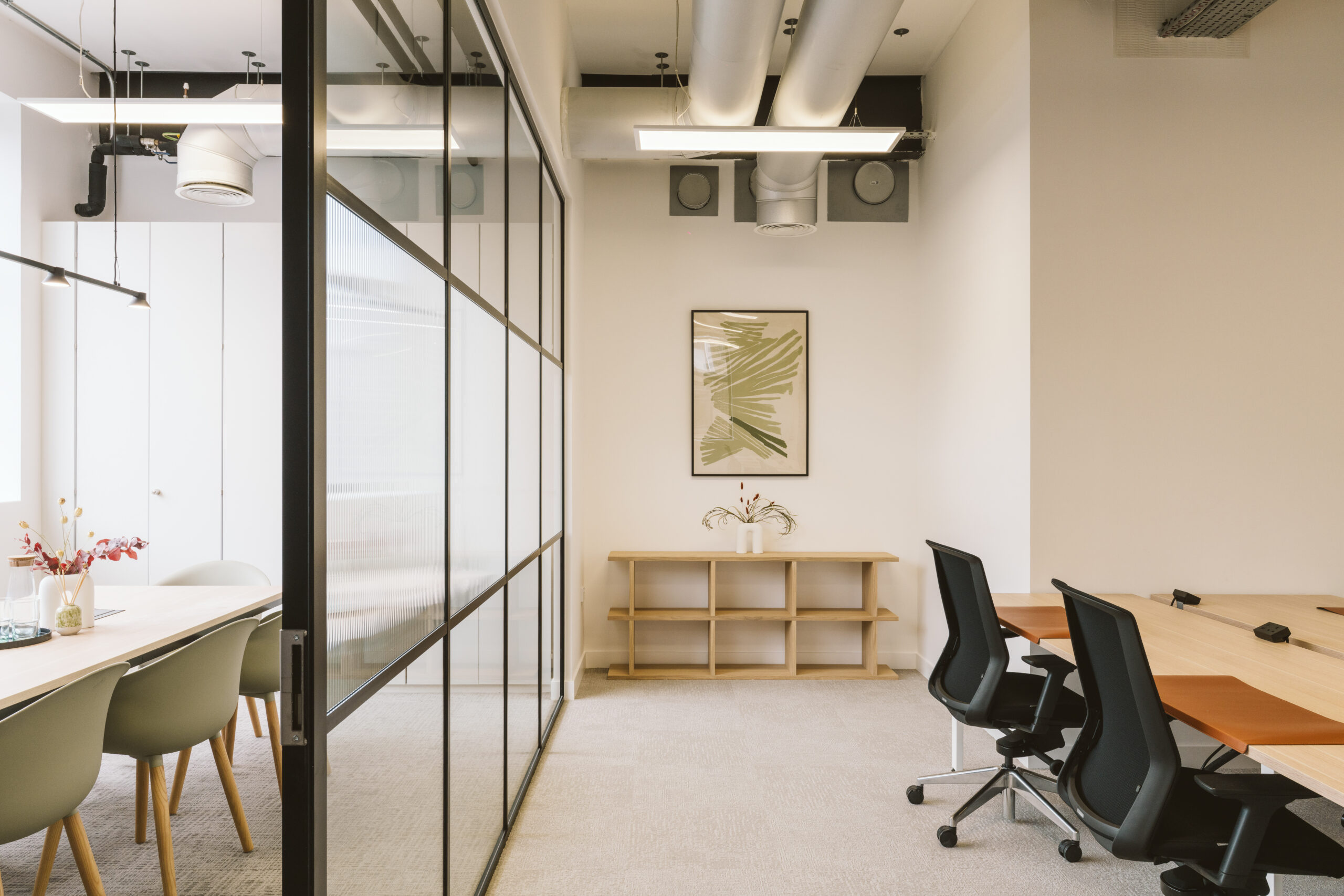 Feature lighting and Crittall-style glazing were added to balance openness with acoustic separation. Meeting rooms were reconfigured and upgraded with fabric wall panelling, door wrapping, and new furniture to create a refined, professional finish. Existing M&E systems were retained to ensure efficiency and cost-effectiveness.